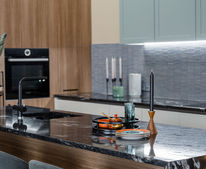 Aukštų lubų, konceptualiai suzonuota virtuvės–svetainės erdvė jungia riešutmedžio apdailas, šalavijo spinteles ir juodo akmens salą. Grafiškas lamelių ritmas, apšviesta stiklinė indauja, dramatiškos užuolaidos bei konjakinės kėdės formuoja prabangiai šiuolaikinį charakterį.